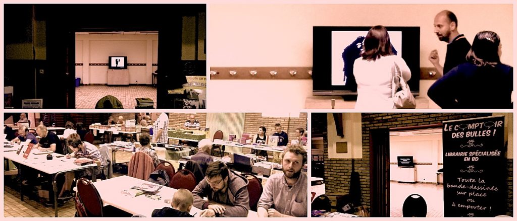 Préam’Bulles ! La première édition de la fête du livre et de la BD à Bavay a été l’occasion d’exposer les images des travaux que nous avons réalisés sur le livre L’étrange bibliothèque de Murakami avec les élèves de classe Segpa du Collège Dupleix de Landrecies et ceux de 6ème, 5ème et 3ème du Collège Jean Lemaire de Belges à Bavay.
